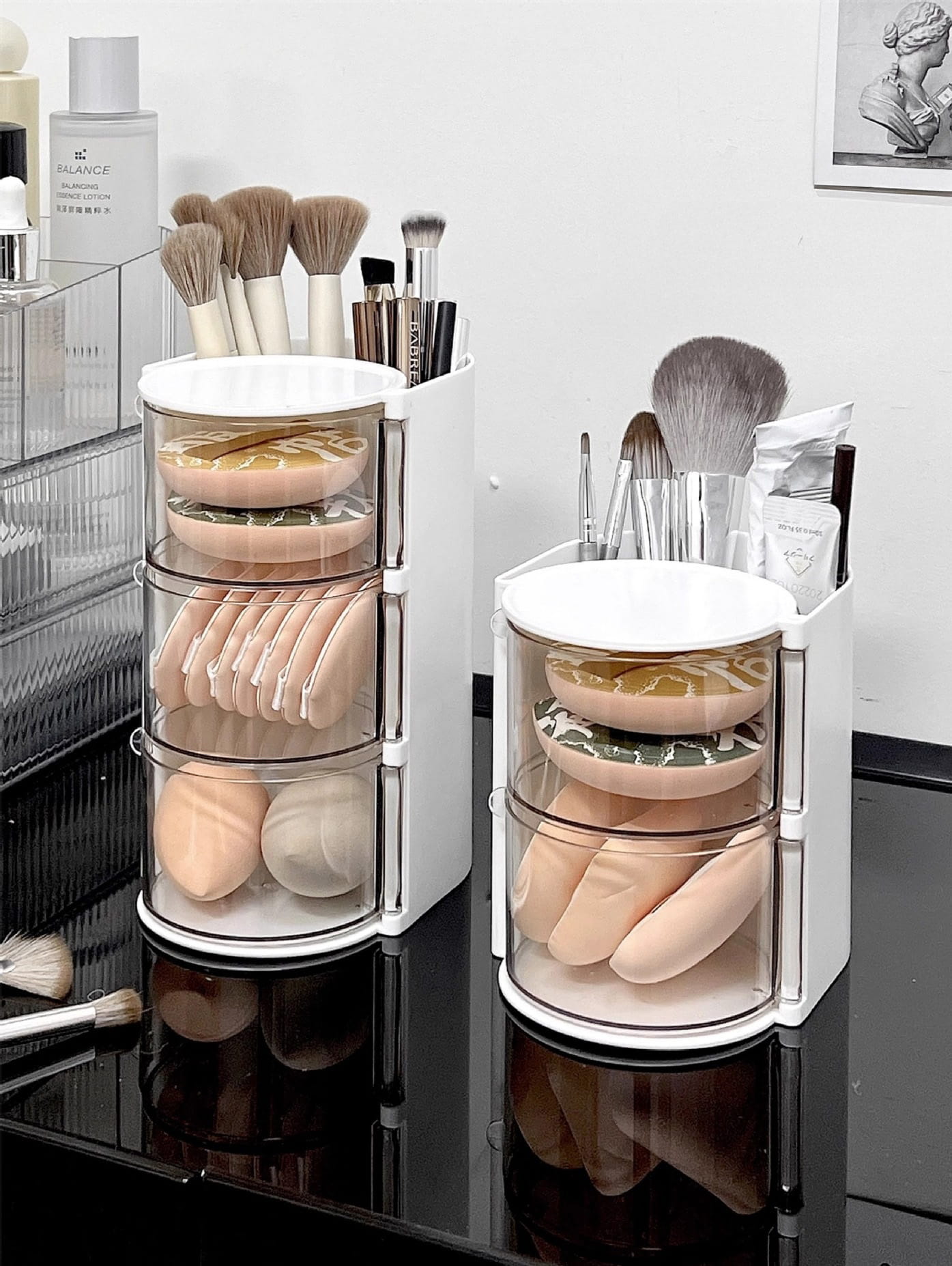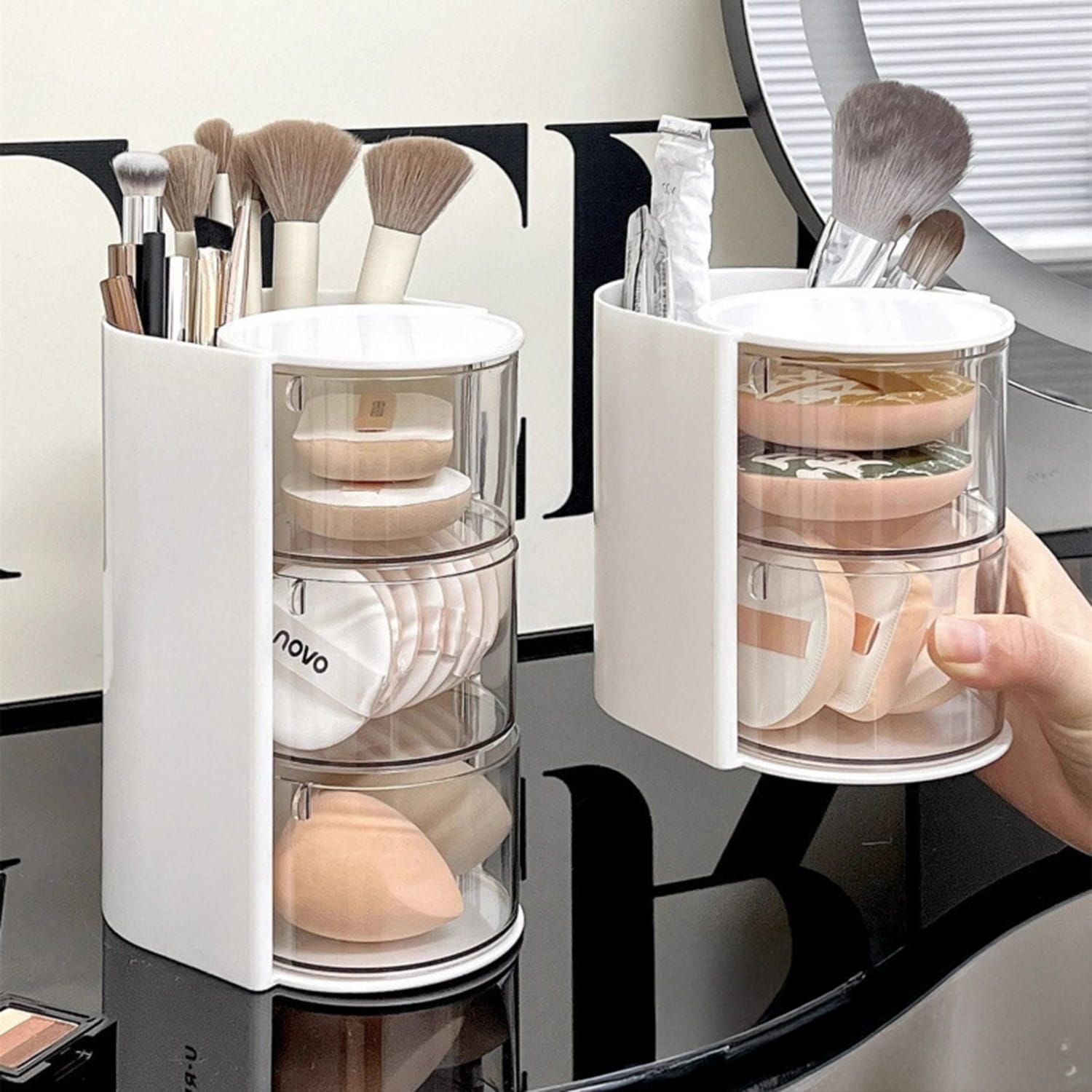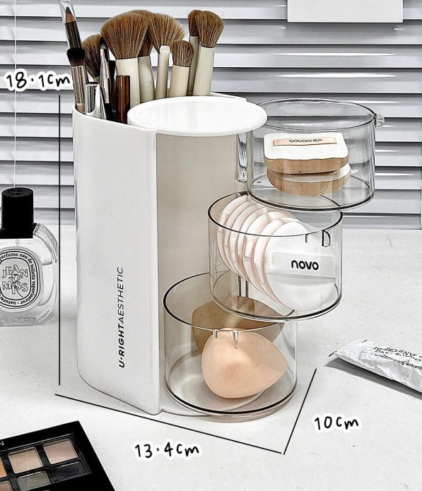 Wyposażony w trzy przezroczyste, obrotowe pojemniki oraz górną przegrodę na pędzle i akcesoria, pozwala wygodnie przechowywać wszystkie niezbędne kosmetyki w jednym miejscu.