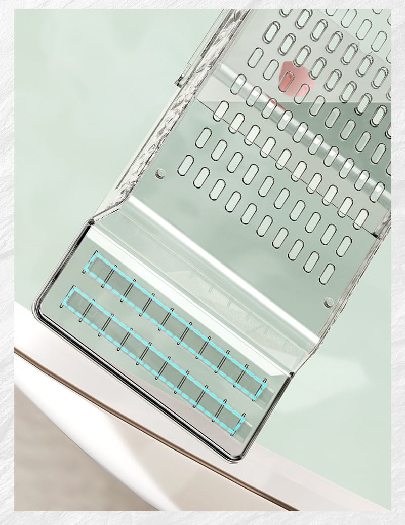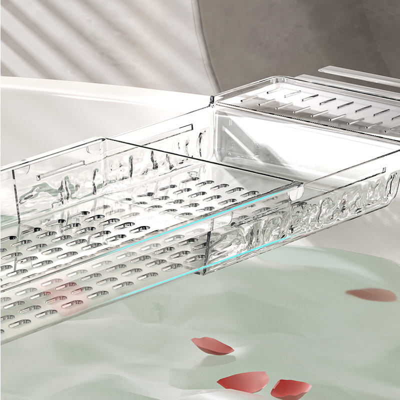 Półka łazienkowa na wannę z przezroczystego, sztywnego tworzywa sztucznego.