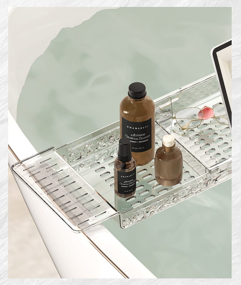 Jest szeroka i posiada rozsuwane ramiona, dzięki czemu zmieszczą się na niej również napoje, przekąski, kremy czy akcesoria do mycia.